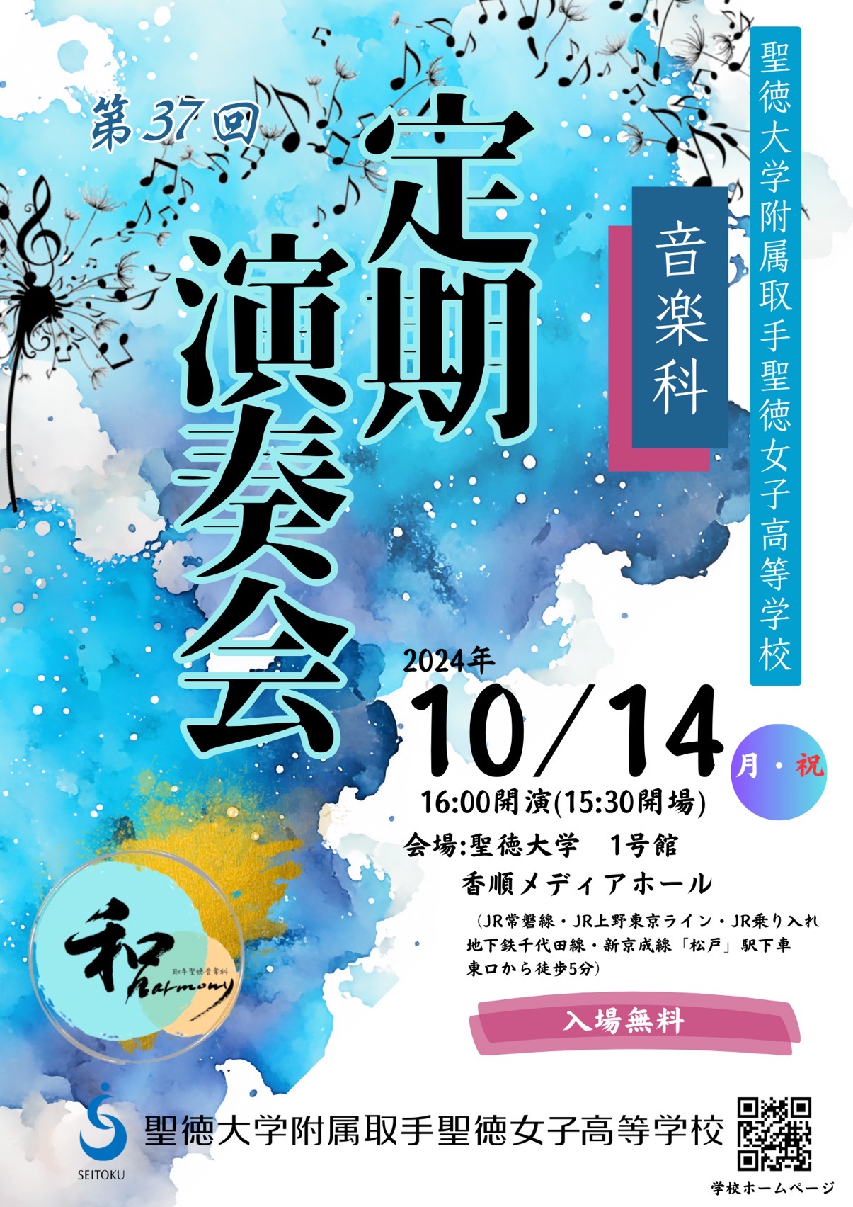 コントラバスの講師を務めている取手聖徳女子高校の音楽科では10月14日(月/祝日)千葉県松戸市にある聖徳大学1号館 香順メディアホールにて第37回音楽科定期演奏会を開催します。